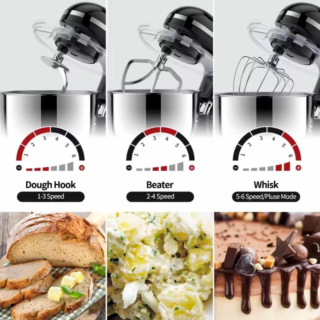 • Speed 1–2 (Low) – Gently fold in flour, mix light batters, or start kneading dough without splashing.